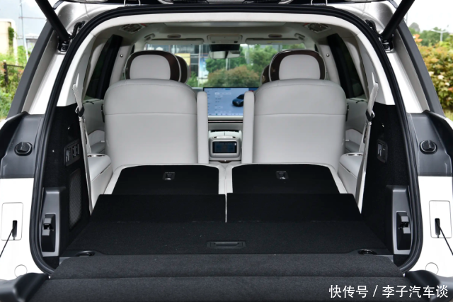 打开电动后备箱发现该车配备了同级别少见的“天地门 ”,这点绝对值得给了好评,下半部分尾门打开之后可以跟后备箱地台处于水平位置,支持承重300kg的重量。当然用户也可以不打开下半部分尾门,只打开上半部分尾门。将第三排座椅放倒,直接跟后备箱形成一个纯平空间,收纳一些大体积行李没问题。后备箱内搭载多个便捷配置,为日常出行提供更多方便。
